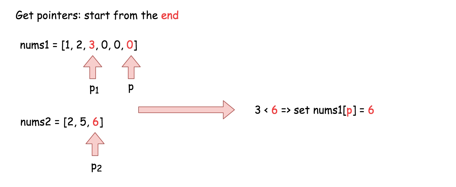 The algorithm is similar to before, except this time we set p1 to point at index m - 1 of nums1, p2 to point at index n - 1 of nums2, and p to point at index m + n - 1 of nums1. This way, it is guaranteed that once we start overwriting the first m values in nums1, we will have already written each into its new position. In this way, we can eliminate the additional space.